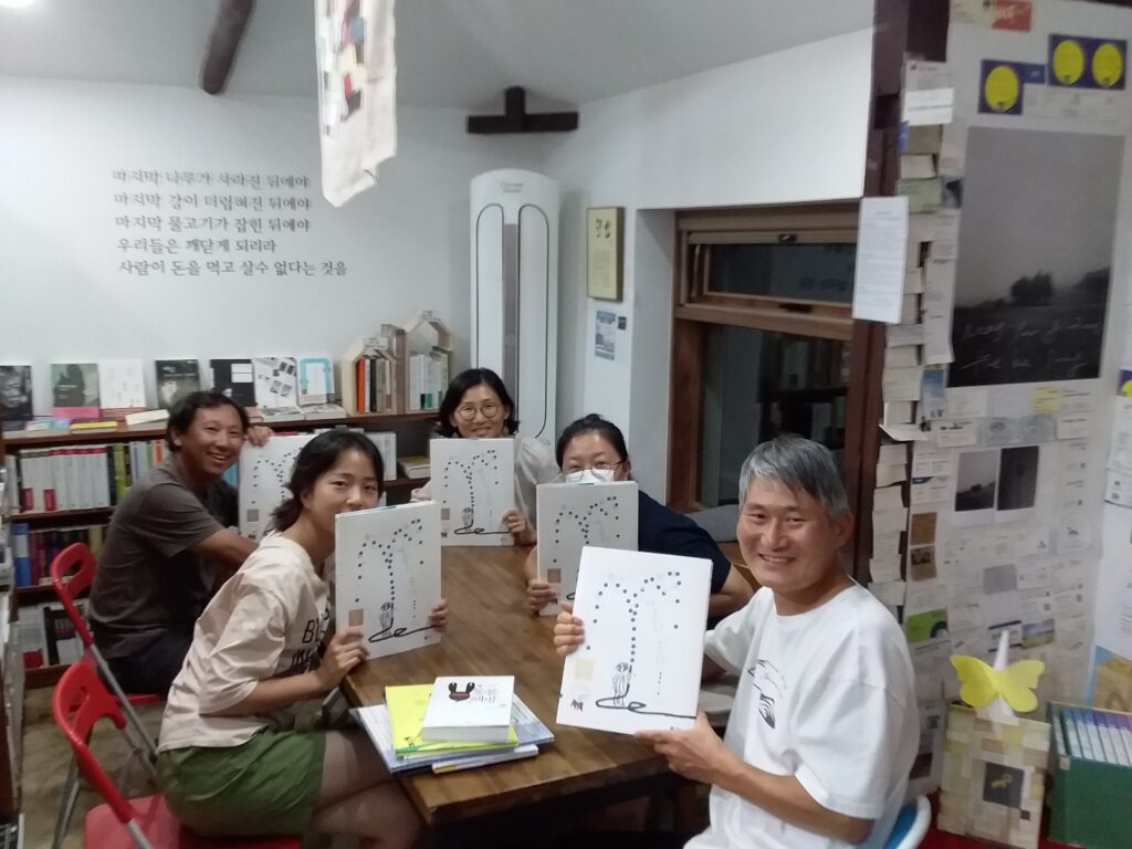 은종복 : 안녕들 하셨어요. 코로나19바이러스로 모두들 안녕하지 못하지만 이렇게 인사를 나누네요. 오늘은 한국문화예술위원회에서 지원해 주는 세 번째 모임이에요. 저희 책방에서 하는 마지막 모임이죠. 사실 아시겠지만 ‘제주그림책읽기모임’은 그동안 잘 되지 않았지요. 올해 1월부터 시작을 했는데 아이들이 같이 오면서 책읽기가 집중이 안 되었어요. 저는 그냥 아이들도 모임에 같이 오면 좋겠다고 생각했는데, 아이들이 어리다 보니 누군가 돌봐야 해서 모임이 흐트러졌죠. 오늘은 아이들이 오지 않아서 집중해서 이야기를 나눌 수 있겠어요. 참석자들도 기존에 오셨던 분들 말고 새롭게 꾸렸어요. 아무튼 오늘 모임에 오셔서 고맙습니다.