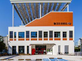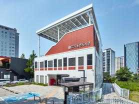 강동구립둔촌도서관은 일자산을 마주보며 도심 속 자연에서 책과 함께 쉬어갈 수 있는